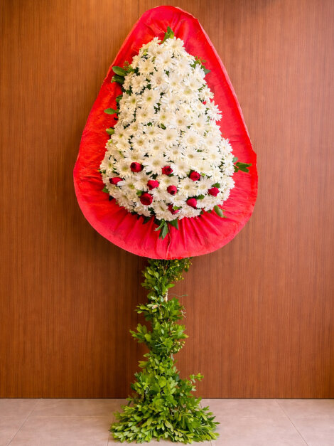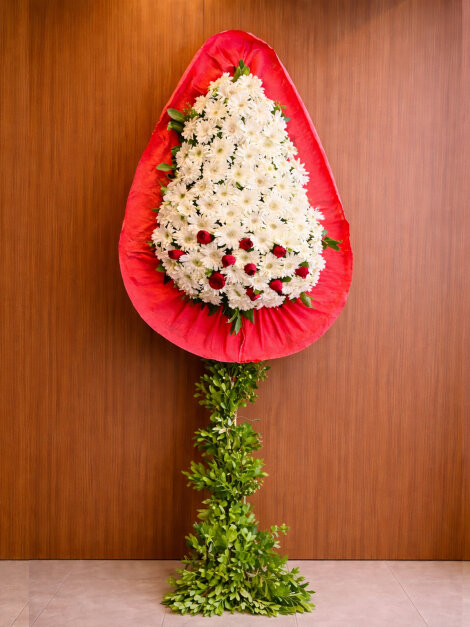 Beyaz gerbera ve kırmızı güllerin uyumuyla hazırlanan ayaklı sepet çelenk, yaklaşık 200 cm yüksekliği ile bulunduğu ortamda dikkat çeken şık ve etkileyici bir tasarıma sahiptir. Beyaz gerberaların sade ve zarif görünümü, kırmızı güllerin güçlü ve dikkat çekici etkisiyle birleşerek hem estetik hem de anlam yüklü bir sunum oluşturur.