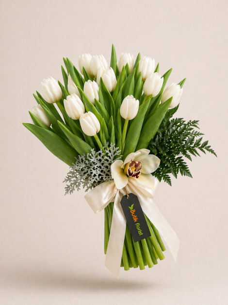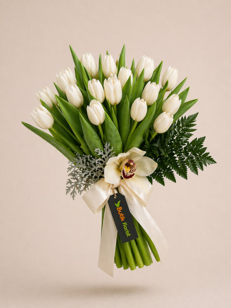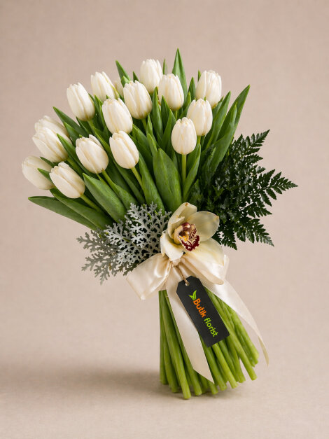 20 adet beyaz laleden oluşan bu özel buket, zarif orkide kandili dokunuşuyla şık ve asil bir görünüm sunar. Saflığın ve zarafetin simgesi beyaz laleler, özenle seçilen detaylarla kusursuz bir uyum yakalar. Bukette kullanılan yardımcı materyaller, mevsimsel koşullar ve stok durumuna bağlı olarak değişiklik gösterebilir..