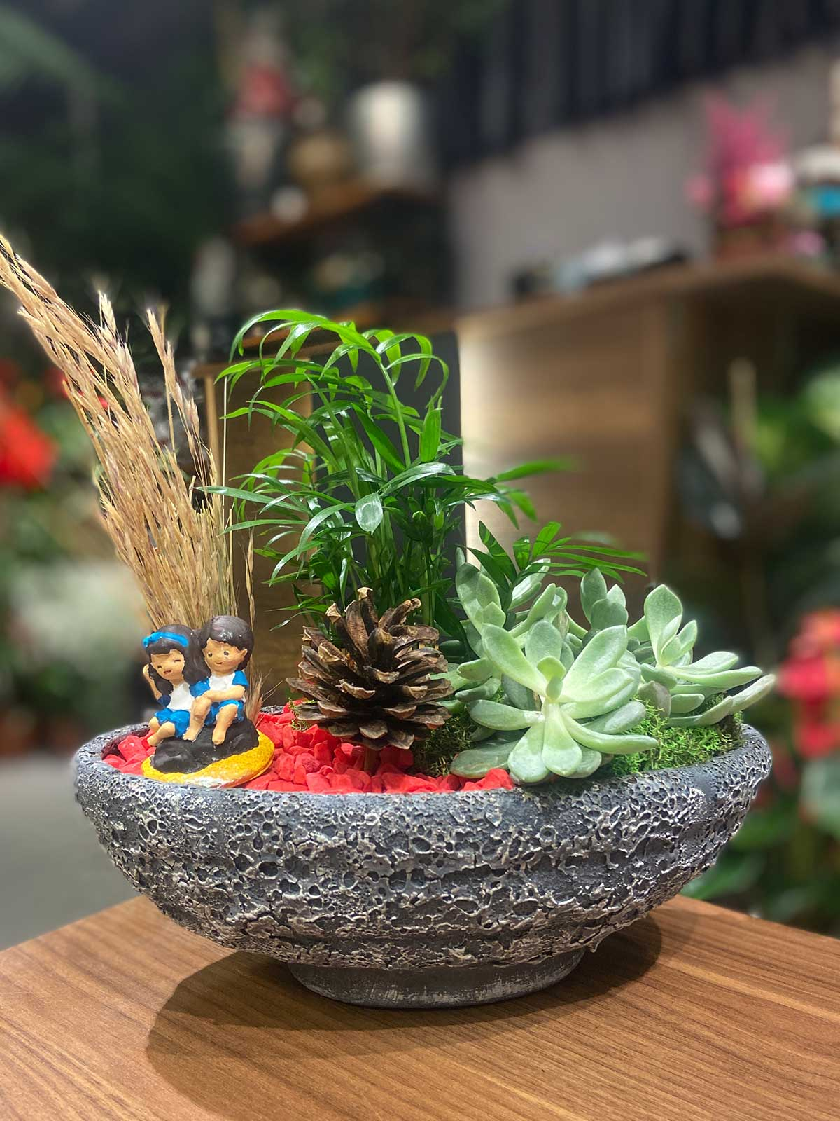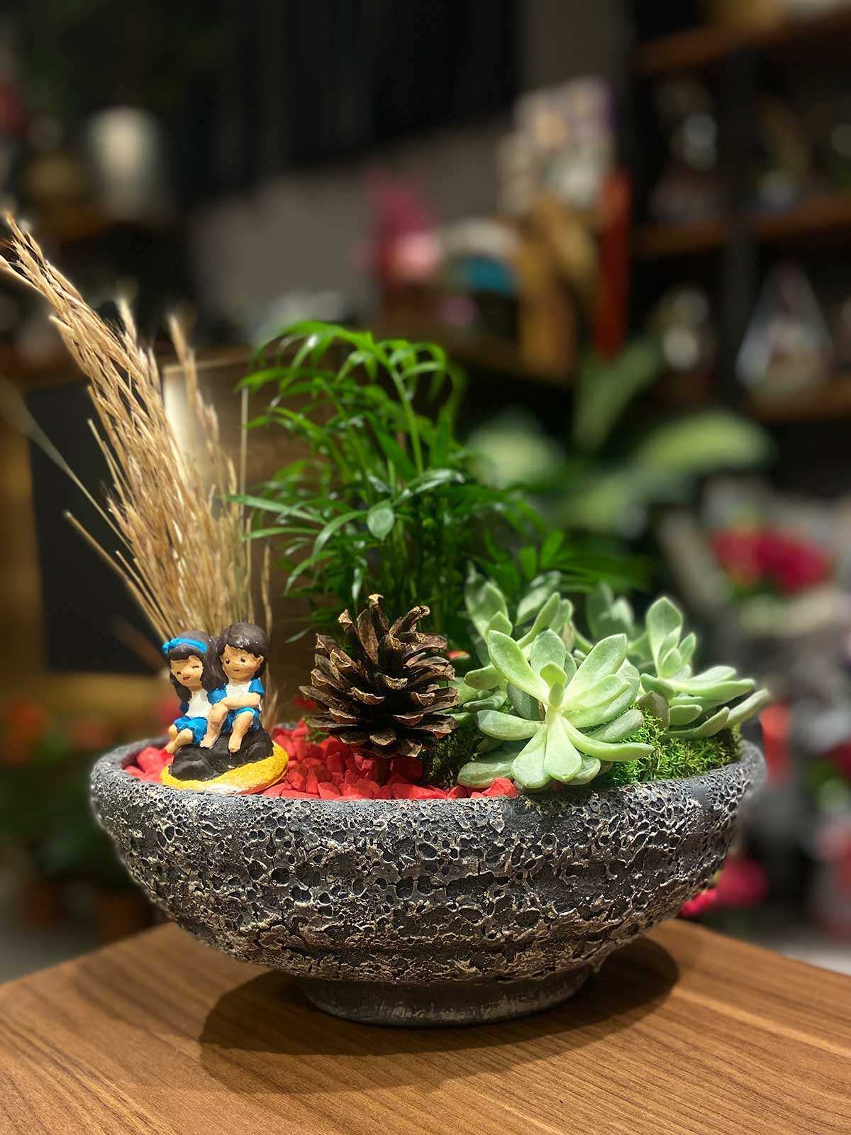 Areka ve Mini Sukulent bitkilerimizle tasarladığımız bu antik seramik saksı içerisinde yer alan mini bahçe tasarımımız sevdikleriniz için doğru bir hediye olabilir.