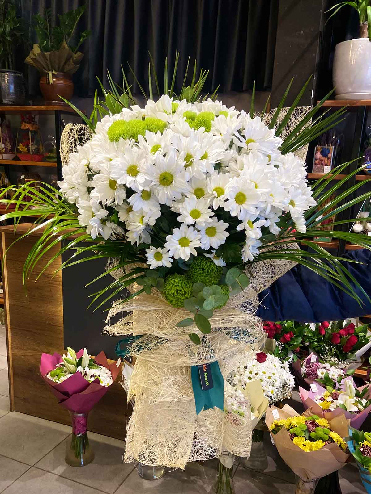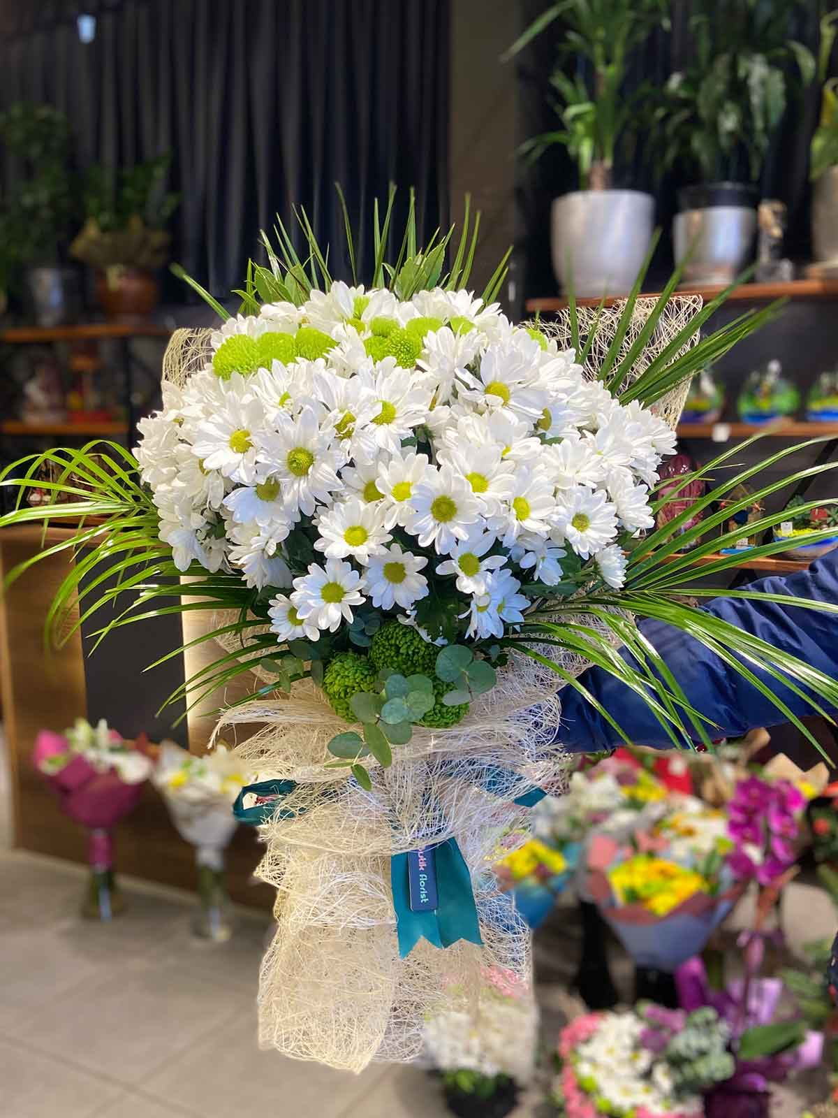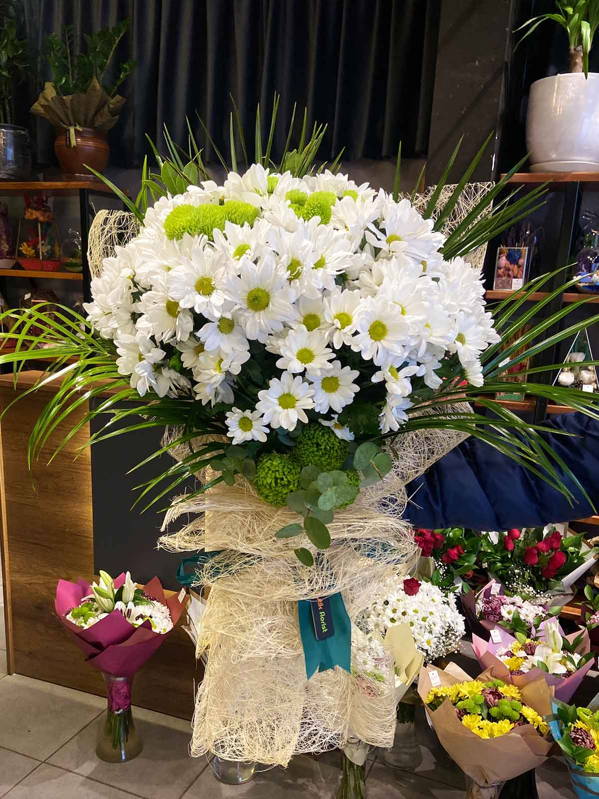 Beyaz ve yeşik renk kirzentemlerle hazırlanmış beyaz papatya buketi