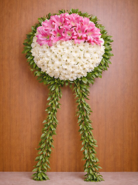 Pembe lilyum ve beyaz gerberalarla özenle hazırlanan bu 200 cm cenaze çelengi, zarif ve etkileyici görünümüyle son görevlerinizi en anlamlı şekilde yerine getirmenizi sağlar.