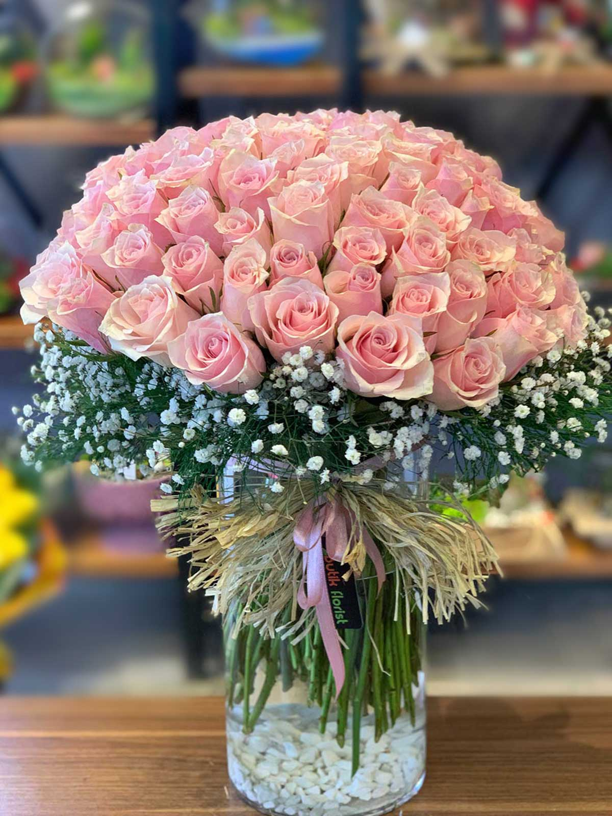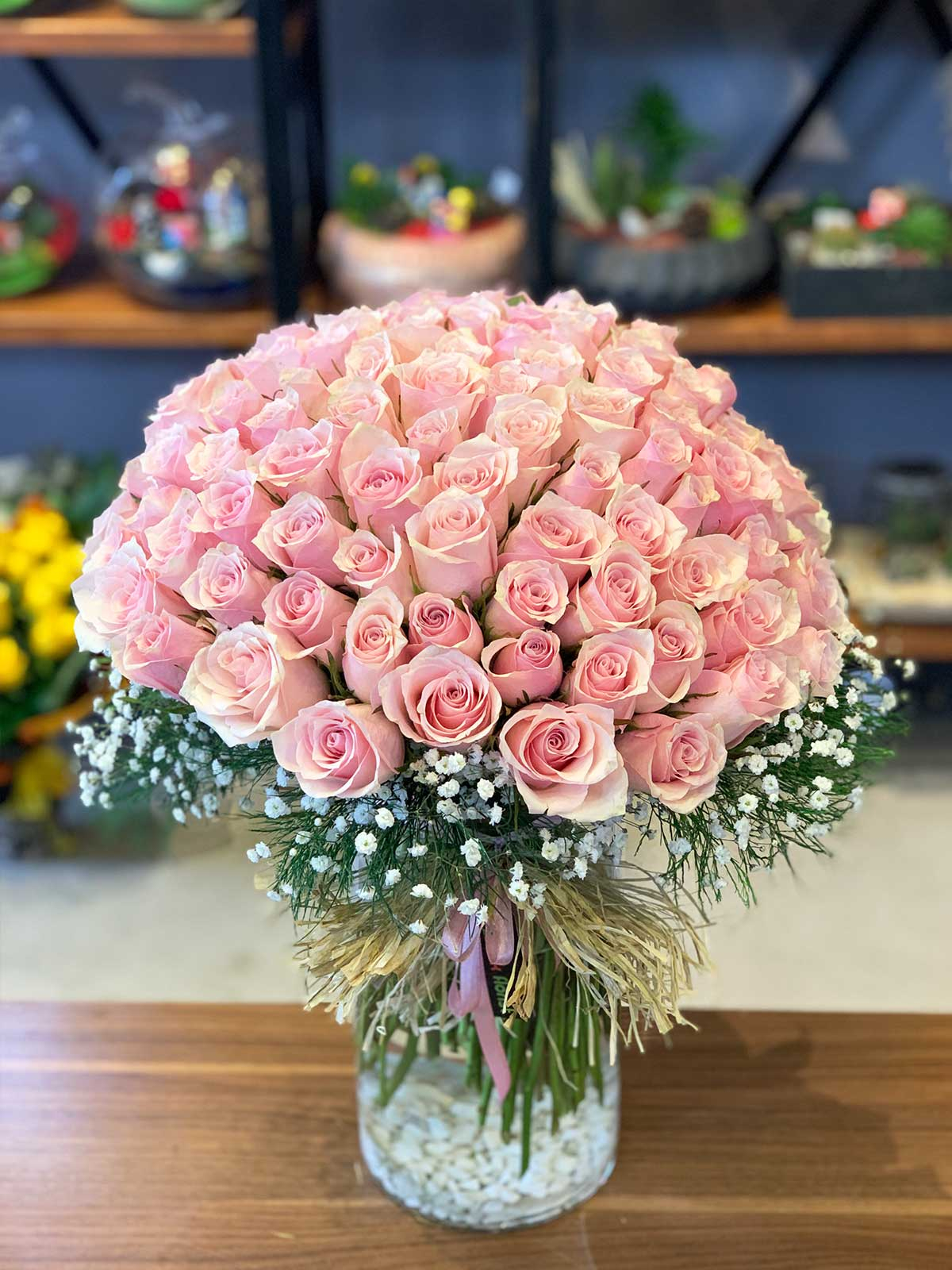 cam vazo içerisinde cipso ve yeşilliklerle süslenmiş.