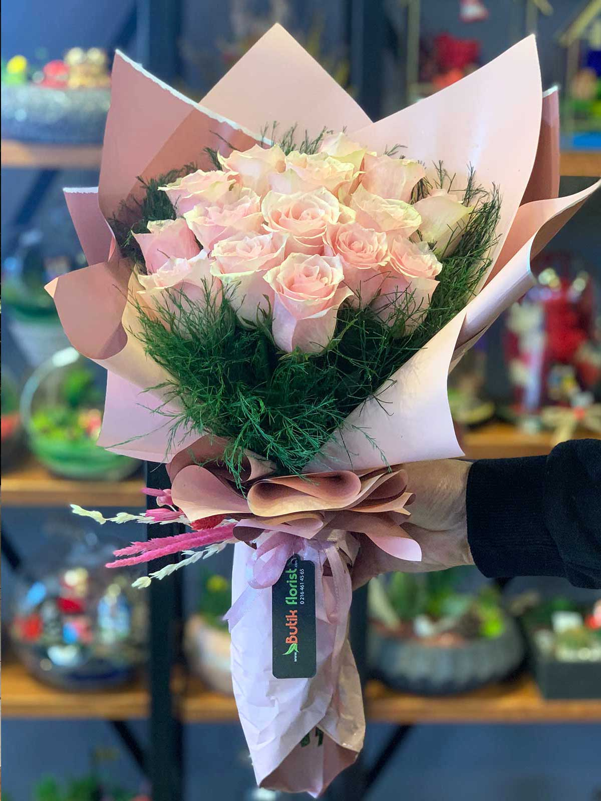 15 adet pembe gül buketi yeşilliklerle süslenmiş